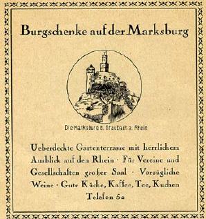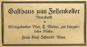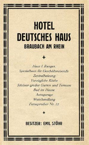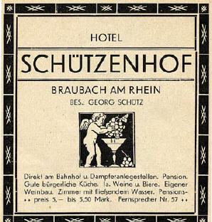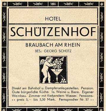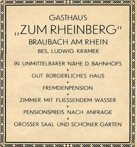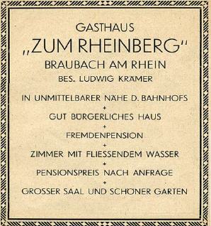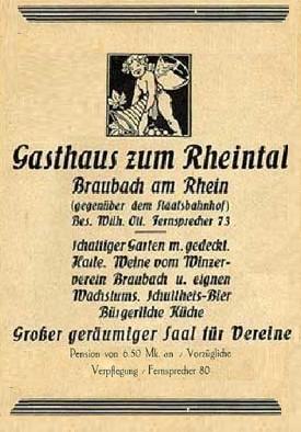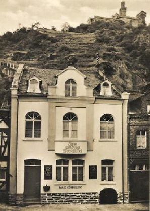Das Bild unten zeigt das Hotel-Restaurant "Nassauer Hof" in der Wilhelmstrasse 1. Das Foto enstand 1931. Inhaberin war Frau Ww. Schinkenberger. Im zweiten Weltkrieg ca 1939 wurde das Hotel geschlossen. Nach dem Krieg Umbau und Eröffnung der Volksbank-Braubach, die 1982 nach Abriss der alten Schule dort ihr eigenes Gebäude errichtete. Danach wurde eine Diskothek eröffnet, die in Folge mehrmals den Pächter und einmal den Namen wechselte. Inszwischen hat das Gebäude einen neuen Besitzer und dient nur noch als Wohnhaus.