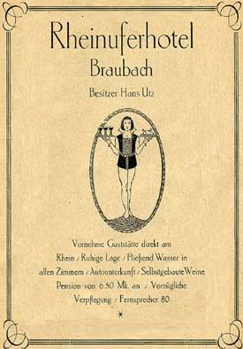 Die Aufnahme zeigt das Rheinuferhotel etwa um 1920. Besitzer war damals " Hans Utz ". In den folgenden Jahrzehnten hat es mehrmals erheblich sein äußeres Erscheinungsbild gewechselt.