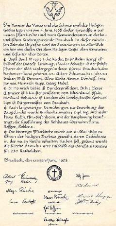 So entstand die Planung für einen Neubau, 1959 wurde nach einem geeigneten Bauplatz gesucht, 1964 wurde die Grundstücksfläche in der Hube erworben und 1967 nach Plänen des Architekten Busch, mit dem Bau des Getreidesilos (Aussage von Touristen) begonnen. Die alte St. Barbara Kirche wurde 1969 abgebrochen. Die neue Heilig-Geist-Kirche wurde am 9. 5. 1970 von dem Limburger Bischof Dr. Wilhelm Kempf eingeweiht. Heute ist die Kirche wieder zu groß und die Unterhaltungskosten, nicht zuletzt wegen der steigenden Energiepreise, verursachen Probleme.
