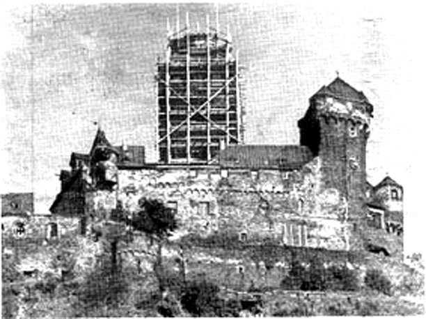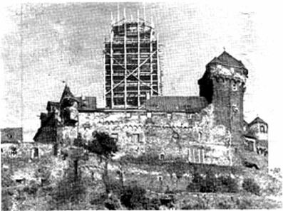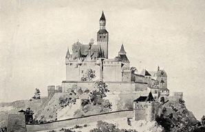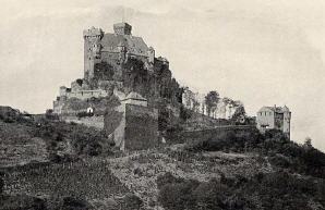 So übernahm Bodo Ebhardt 1900 die Burg, der hohe Bergfried, der ursprünglich dem rechts gezeigten Entwurf entsprach, wurde 1705 nach dem Brand abgetragen, da man das Material für die Wiederherstellung des Rheinbaues verwendete. |