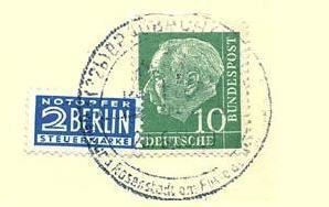 Zwischen dem 1. Dezember 1948 und dem 31. März 1956 mussten alle Postsendungen innerhalb der Bundesrepublik zusätzlich zur normalen Frankatur mit einer Notopfermarke frankiert werden. Es handelt sich also um so genannte Zwangszuschlagsmarke. Der Wert dieser Marken betrug 2 Pf. Zum Vergleich: ein Fernbrief kostete damals 20 Pf. Innerhalb der fünf Jahre des Verwendungszwangs wurden über 17 Milliarden Marken verkauft. 340 Millionen DM gingen auf diese Weise nach West-Berlin. |