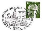 Die Westalliierten führten nach dem Krieg in Deutschland ein Postleitgebiet ein, Braubach erhielt die Nummer 22b. Allerdings bezog diese Zahl sich nicht allein auf Braubach, sondern auf die gesamte Besatzungszone. | Später führte die Deutsche Bundespost 4stellige Postleitzahlen ein, Braubach bekam die Zahl 5423 und nach der Wiedervereinigung eine 5stellige 56338. Das Bild zeigt einen Sonderstempel Braubach aus dem Jahre 1955 |