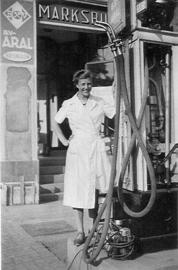Nachdem der Kraftverkehr immer mehr an Bedeutung gewann, wurde 1925 von Karl Nicolai die erste Tankstelle in Braubach eröffnet. Diese befand sich links von dem heutigen Cafe Marksburg. Die zweite folgte 1927 in der Lahnsteiner Staße bei der 1929 gegründeten Spedition Michel. Die ersten Kraftpostlinien wurden eröffnet. Karl Nikolai zunächst mit einem Omnibus vertreten, gründete die Braubacher Kraftverkehrsgesellschaft. Erst 1934 erreichte die rechtsrheinische Straße (heute B 42) den Stand einer Landstraße und diente neben militärisch-strategischen Überlegungen vor allem der Belebung von Industrie und Handel. Daneben sollte die Arbeitslosigkeit vor allem im Bereich der industriearmen Gegenden behoben werden. Auch die königlich-preußische Post sollte durch schnellere Beförderungszeiten davon profitieren. Rechts im Bild: Elisabeth Gemmer geborene Nicolai vor der Tankstelle ihres Vaters |