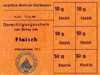| Im August 1939 wurde der Kauf von Lebensmitteln und Artikel des täglichen Bedarfs eingeschränkt und eine Bezugsscheinpflicht eingeführt. Noch schlimmer wurde es im April 1942, die Lebensmittelrationen verringerten sich drastisch. Pro Woche durfte ein Erwachsener 300 g Fleisch, 200 g Fett und 2 kg Brot verzehren. Selbst wenn man Geld und Lebensmittelkarten hatte, mußte man oft stundenlang Schlange stehen, um mittags etwas auf dem Tisch zu haben. Und dann konnte es vorkommen, daß die letzen in der Schlange mit leeren Händen nach Hause kamen, weil an diesem Tag schon alles ausverkauft war. Es blieb nur, es am nächsten Tag erneut zu probieren. |